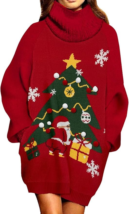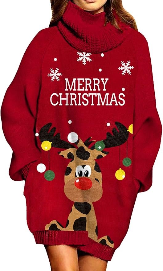 Pink Queen Ugly Christmas Sweater Dresses for Women Oversized Loose Fit Knit Dress with Pocket |